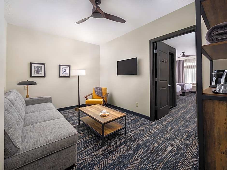 This suite features a separate bedroom with a TV, a living room with a sofa and a TV and a kitchen with stove and kitchenware.